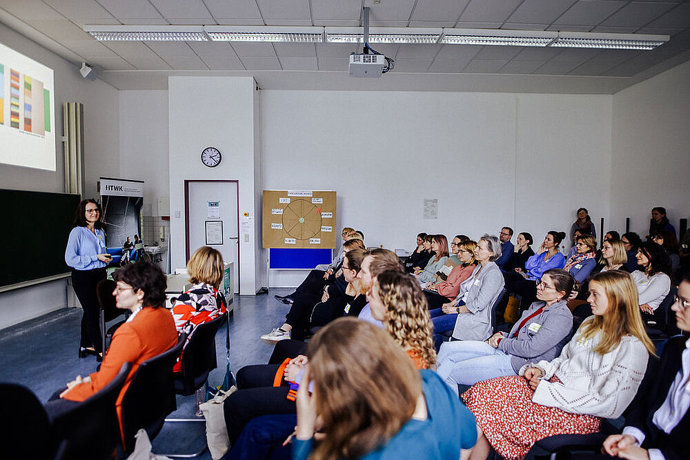 Mit dem Aufruf "Frauen, seid mutig, vernetzt Euch und sucht Verbündete" sprach sich auch Professorin Graßmann (MDC, Berlin) in ihrer Keynote für gegenseitiges Empowerment aus. Unter dem Thema „Empowering Excellence: Frauen im Wissenschaftsnetzwerk“ lud sie die Teilnehmerinnen dazu ein, proaktiv die nächsten Karriereziele anzugehen und sich engagiert den Herausforderungen einer wissenschaftlichen Laufbahn zu stellen. Wie sich der Alltag im Wissenschaftskontext an der HTWK Leipzig real gestaltet und welche unterschiedlichen Perspektiven und Erfahrungen es zum Thema wissenschaftliche Karrierepläne gibt, konnten die Gäste im Anschluss bei der Podiumsdiskussion von (Nachwuchs-) Wissenschaftlerinnen der HTWK Leipzig erfahren.