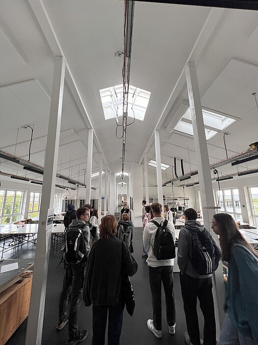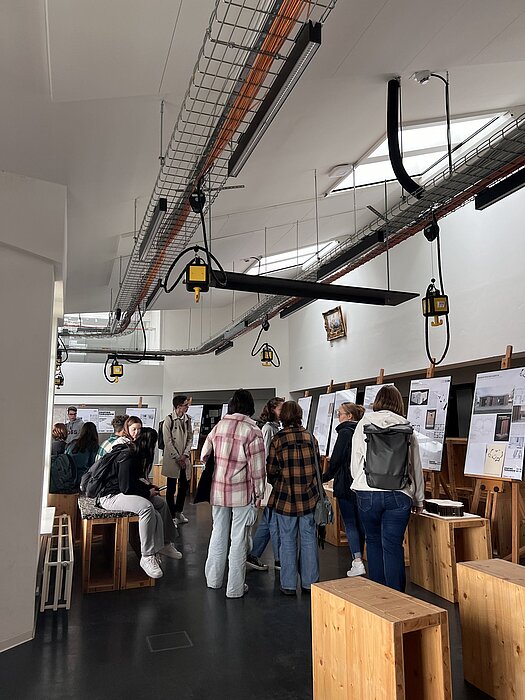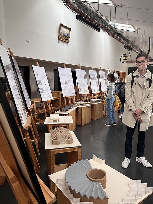 Am letzten Tag der Ferienhochschule erlebten knapp 40 Schülerinnen und Schüler gemeinsam mit einer Studentin, was es bedeutet, Architektur zu studieren. Nach einer kurzen Einführung sollten die Teilnehmenden in Gruppen eine kreative Aufgabe lösen und präsentieren. Das Basteln, Kleben, Schneiden und Zeichnen in den Atelierräumen kam dem Alltag des Architekturstudiums schon sehr nah.