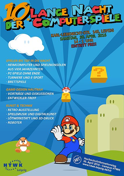 Im Anschluß an den Hochschulinformationstag können Besucher ab 14:00 Uhr bei der "Langen Nacht der Computerspiele" bis tief in die Nacht zum Spielen an der HTWK Leipzig zusammenkommen.