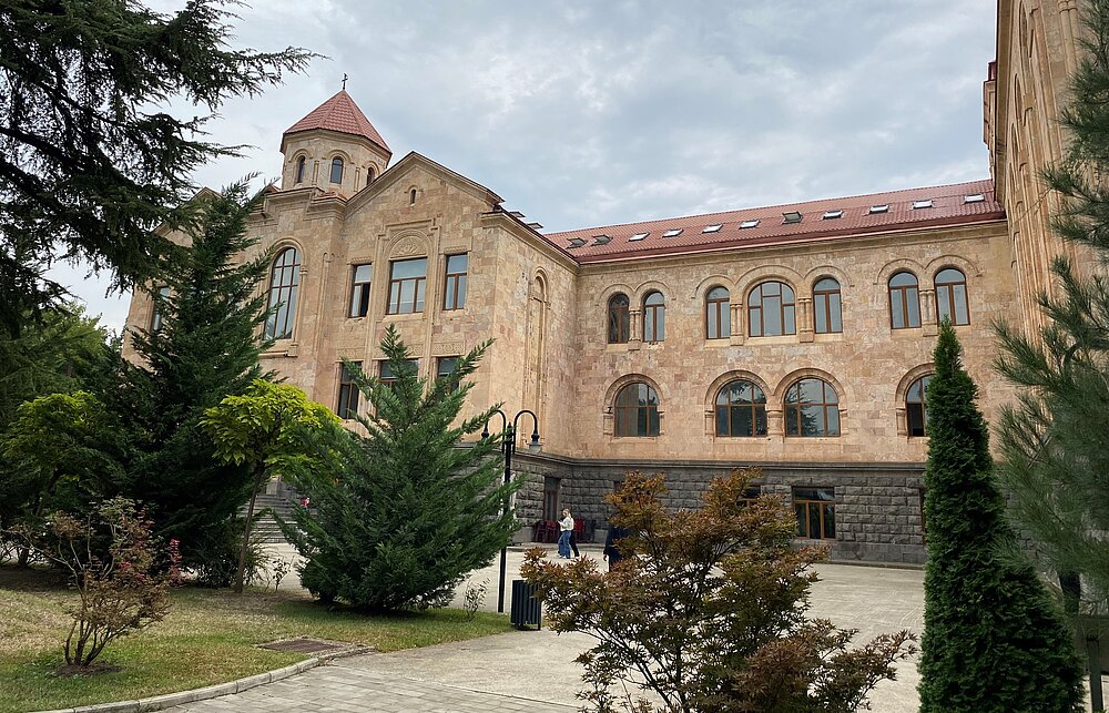 Die Caucasus University (CU) wurde 2004 gegründet und ist eine private Universität mit Schwerpunkt auf Betriebs- und Volkswirtschaftslehre. Die CU zählt sicherlich zu den besten privaten Hochschulen im Bereich Wirtschaftswissenschaft in Georgien. Der Campus der CU befindet sich ca. 2 km nördlich des Stadtzentrums von Tblissi in einem historischen Gebäude aus dem frühen 20. Jahrhundert und ist mit Metro und Bus gut zu erreichen. Neben sehr gut ausgestatteten Hörsälen gibt es zwei Cafeterias und einen kleinen Park mit Bühne, Sitzgelegenheiten, Hängematten und last but not least ein (intensiv genutzter!) Kunstrasen-Fußballplatz. Auf dem Campus merkt man schnell, dass der Auftritt von Kvaratskelia & Co. bei der Euro 24 in Georgien etwas ausgelöst hat (ein Trikot von Kvaratskelia hängt im Eingangsbereich der CU). Zugleich wurde im Gespräch mit den Kolleginnen der CU der starke Wunsch der jüngeren und gebildeten Georgier in Richtung Westen und EU sehr deutlich.