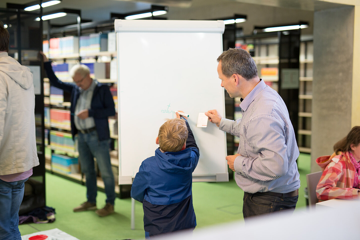 Auch Medienzentrum, Gutenberg-Bau und Hochschulbibliothek haben zu dieser besonderen Nacht ihre Türen geöffnet. Während man in letzterer endlich einmal lärmen und spielen darf, betonieren vor dem Gebäude zahlreiche Kinder kleine Betonmännchen. Daneben wird ein Deichbruch simuliert. Alumnus Enrico Apelt ist dafür extra aus Frankfurt angereist: „Der Besuch der ‚Langen Nacht der Wissenschaften‘ hat für mich sowohl berufliche als auch private Gründe. Ich arbeite als sogenannter ‚Risikoingenieur‘ im Bereich Industrieversicherungen, da gehört Hochwasserschutz neben Brandschutz zu den wichtigsten Themengebieten.“