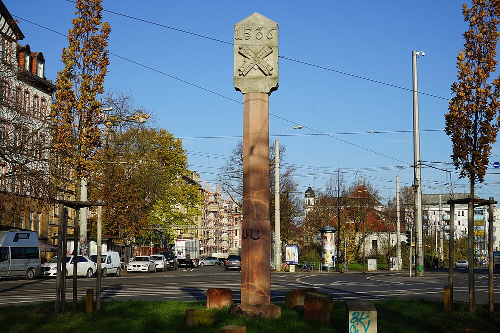 „Das Connewitzer Kreuz, das letzte der vier im Jahre 1536 errichteten Weichbildzeichen der Stadt Leipzig, sollte nach der Neubebauung in der Nähe seines jetziges Standortes wieder aufgestellt werden.“
