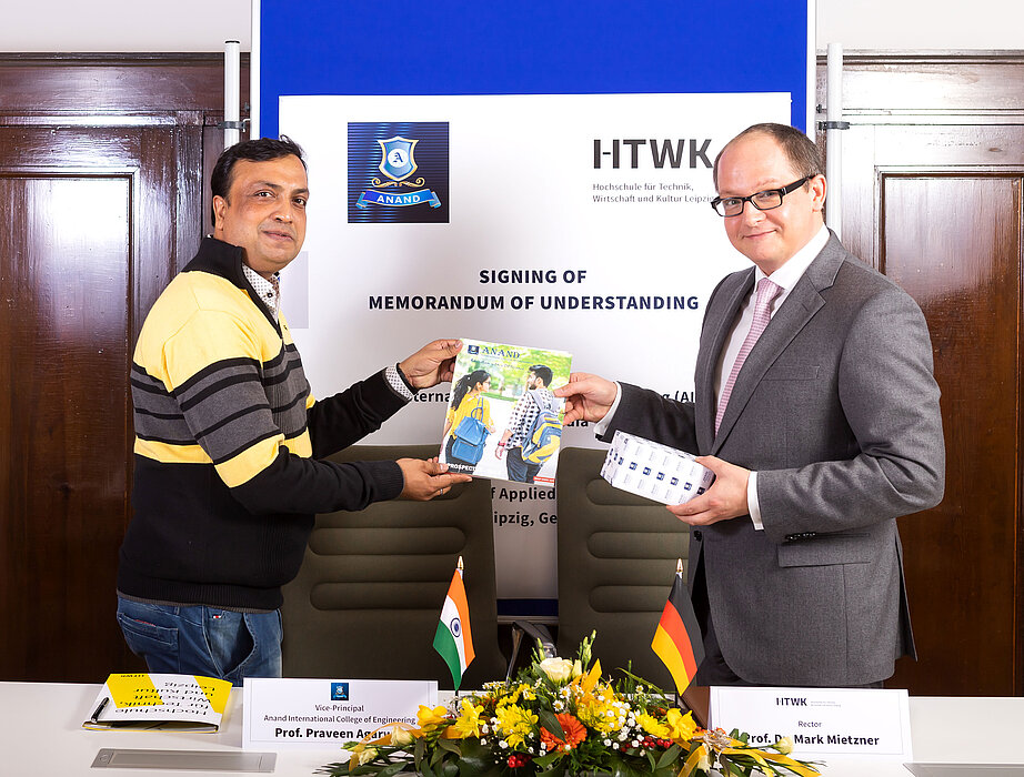 Die HTWK Leipzig zählt seit dem 11. Dezember 2019 eine der bedeutendsten ingenieurwissenschaftlichen Bildungseinrichtungen Indiens zu ihren Partnern. Mit der Unterzeichnung einer Kooperationsvereinbarung zwischen dem ANAND International College of Engineering (AICE) können nun nicht nur Studierende an der jeweiligen Partnerhochschule ein Austauschstudium absolvieren, auch Professoren aus ingenieurwissenschaftlichen Bereichen haben verbesserte Möglichkeiten der Zusammenarbeit in Lehre und Forschung. Initiiert wurde der Kontakt zum AICE über das Mathematisch-Naturwissenschaftliche Zentrum (MNZ) der HTWK Leipzig.