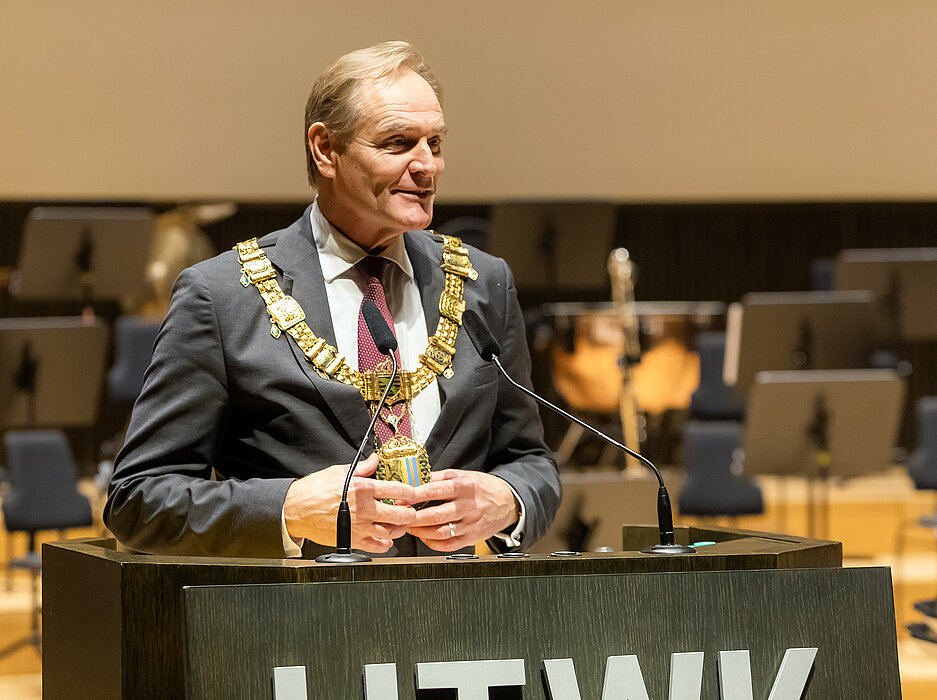 Nach dem feierlichen Einzug des Senats begrüßte Prof. Mark Mietzner, Rektor der HTWK Leipzig, die neuen Studierenden und versprach ihnen eine „prägende Entwicklungsreise“, die ihnen mit dem Studium bevorsteht: „Unsere Welt ist geprägt von einer zunehmenden Komplexität und Vernetzung in nahezu allen Bereichen des täglichen Lebens. Heute vollziehen sich Veränderungen mit immer größerer Geschwindigkeit. Dies verlangt unserem Denken und Handeln eine noch höhere Innovationskraft und Interdisziplinarität ab. Das Wichtigste aber ist für Sie, selbst Fragen zu stellen und eigene Antworten zu finden.“ Das Studium an der HTWK Leipzig sei eine „Vorbereitung auf das noch Unbekannte, das vor uns allen liegt“, so der Rektor weiter. „Behalten Sie Neugier, Entdeckergeist und Abenteuerlust!“