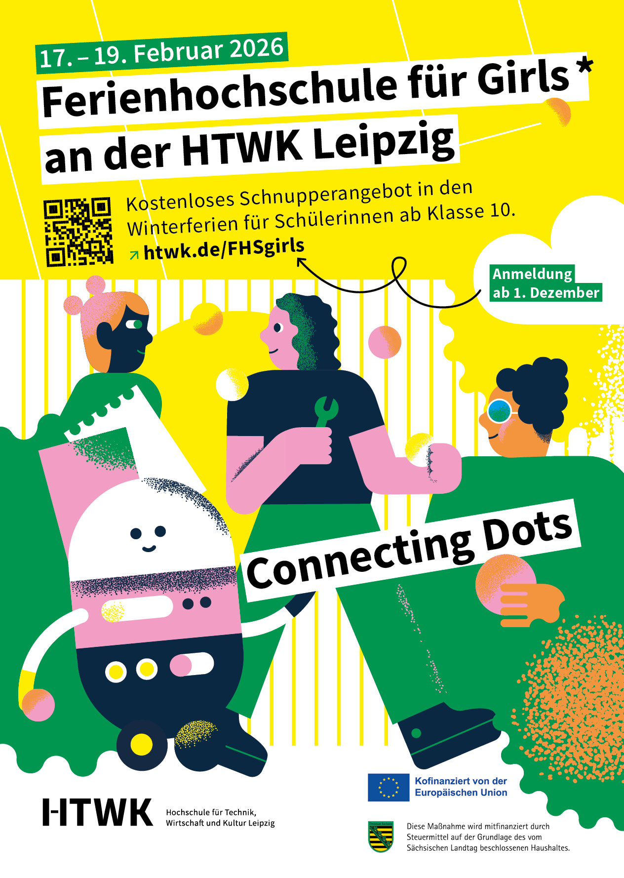 Unter dem Motto „Connecting Dots“ („Punkte verbinden“ oder „Zusammenhänge erkennen“) fand vom 17. bis 19. Februar 2026 die zweite Winter-Ferienhochschule für Girls* an der HTWK Leipzig statt. Rund 20 Teilnehmer*innen nutzten die Gelegenheit Hochschulluft zu schnuppern und die Welt der MINT-Fächer kennenzulernen.