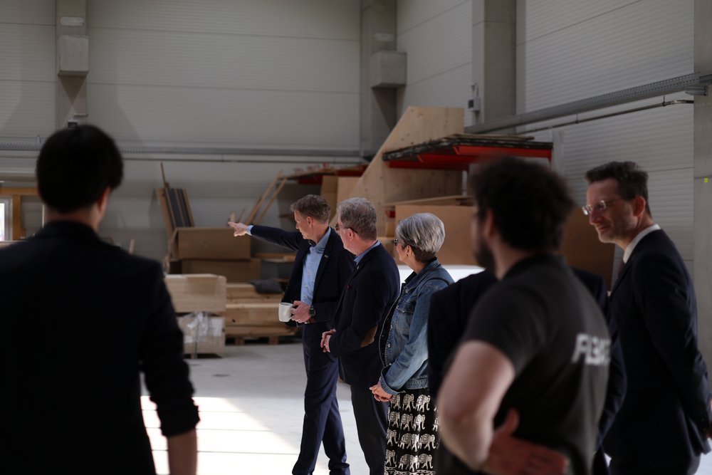 So besichtigen die beiden Vertreter der Republik Südafrika nach einer Begrüßung im HolzBauForschungsZentrum dort mehrere Stationen: Mit Hinblick auf den bald beginnenden Bau der Kranlage stellten die FLEX-Forschenden zunächst die Vision dazu vor. Denn mit deren Fertigstellung entsteht eine einzigartige, großmaßstäbliche Forschungsinfrastruktur, mit der digitale Planungsmodelle für automatisierte Fertigungsprozesse im Holzbau entwickelt und im Realmaßstab getestet werden können. Die Industrieroboter, die dann in zirka fünf Metern Höhe hängen, können über ein 31-Achsen-System nahezu jeden Punkt in der zirka 1.000 Quadratmeter großen Halle ansteuern und so hochgradig flexible Fertigungsprozesse ermöglichen..