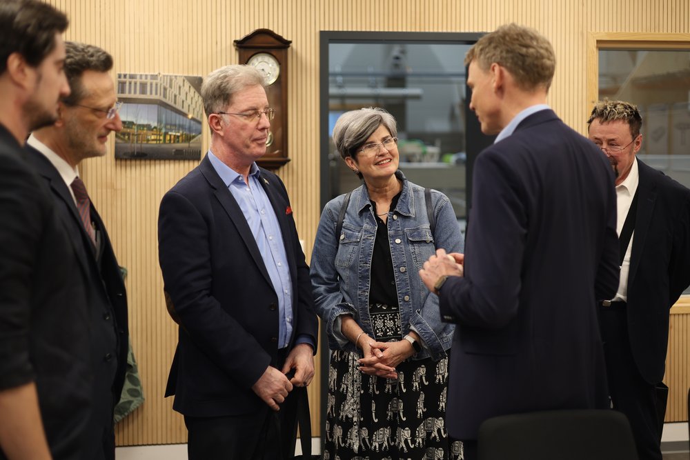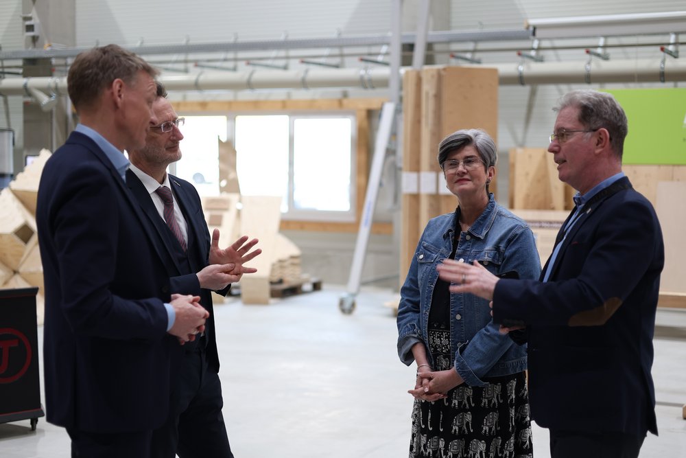 Im HolzBauForschungsZentrum der HTWK Leipzig empfingen HTWK-Rektor Prof. Dr.-Ing. Jean-Alexander Müller sowie der wissenschaftliche Leiter der Forschungshalle Prof. Dr.-Ing. Alexander Stahr und sein Team von der Forschungsgruppe FLEX am 9. März 2026 hohen Besuch: Andries Oosthuizen, der Botschafter der Republik Südafrika in Deutschland, und Prof. Dr. Wolfram Scharff, Honorarkonsul, kamen auf ihrer zweitägigen Reise durch Sachsen und Sachsen-Anhalt nach Leipzig, um sich hier zum Stand der Forschung im digital basierten Bauen mit Holz sowie über mögliche künftige gemeinsame Forschungsprojekte auszutauschen.