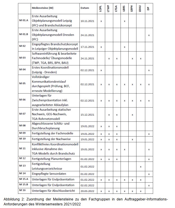 Eine wesentliche Besonderheit ist hierbei: die Arbeit der Studierenden wird in Fachgruppen organisiert: Objektplanung, Tragwerksplanung, TGA-Planung, Brandschutzplanung, Bauphysik und Baubetrieb stehen zur Wahl. Innerhalb dieser Fachgruppen erhalten die Studierenden unterschiedliche BIM-Rollen (BIM-Gesamtkoordinator, BIM-Koordinator, Informations- und Qualitätsmanager, BIM-Autor etc.). Ziel des Moduls ist, dass die Studierenden möglichst schnell selbst organisiert arbeiten. Nach einer anfänglichen Phase der Wissensvermittlung treten die Lehrenden zurück in die Rolle des Auftraggebers und Lernbegleiters.