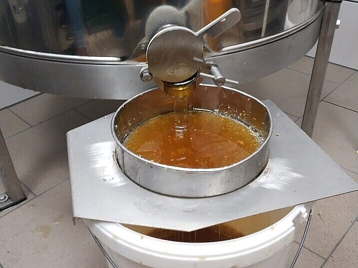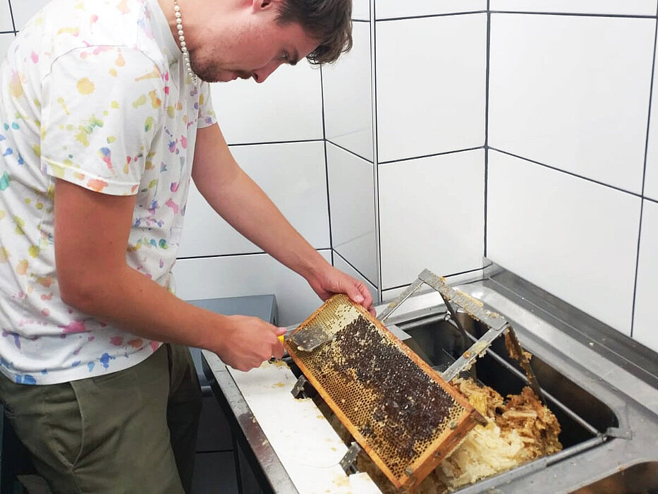 Im Juli brachten die Studierenden den vollen sogenannten „Honigraum“ in die Imkerei von Jochen Holdt und machten sich an die Arbeit: Zuerst müssen die Waben „entdeckelt“ werden, denn die Bienen versiegeln die Öffnungen mit einer Wachsschicht. „Dieses Wachs wird später eingeschmolzen für Kerzen oder Wachsplatten – wir wollen alles verwenden, was entsteht“, betont Annik Helzel. Sind die Waben offengelegt, kommen sie mitsamt der Rahmen in eine Schleudermaschine. Hier werden sie geschleudert, bis die Zentrifugalkräfte den Honig aus den Zellen lösen und er in ein Sammelgefäß tropft. Zum Schluss gilt es noch, die Konsistenz und den Wasseranteil zu kontrollieren, und schon kann der Honig in die Gläser gefüllt werden.