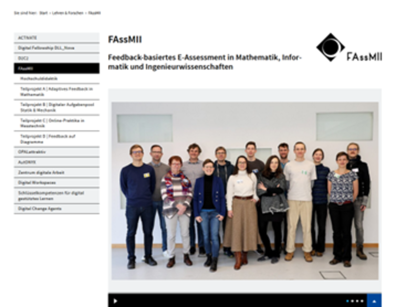 Das Projekt FAssMII (Feedback basiertes E-Assessment in Mathematik, Informatik und Ingenieurwissenschaften) ist zum 31.12.2025 geendet. Seit August 2021 wurde es aus Mitteln der Stiftung Innovation in der Hochschullehre in einer Höhe von über 2,5 Mio Euro gefördert. Ziel dieses Lehr- und Lern-Projektes war es, durch Konzipierung und Umsetzung von feedback-basierten E-Assessments in MINT die Motivation der Studierenden im Lehr- und Lernprozess zu stärken. Entstanden sind verschiedene Feedback-Tools, die bei Anwendung einen signifikanten Mehrwert für den Lehr- und Lernprozess bieten.
