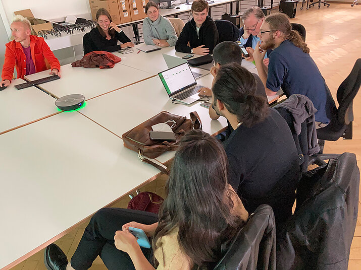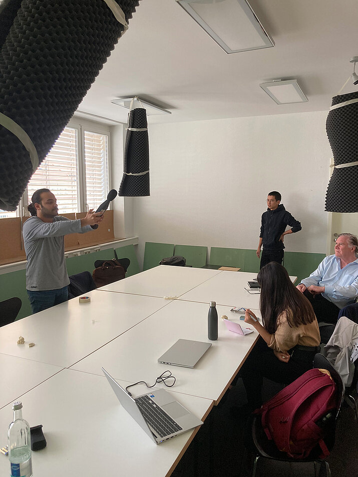 Die Studierenden arbeiteten mit Simulationssoftware, experimentierten aber auch gemeinsam im Raum, um die direkten Auswirkungen kleinerer Maßnahmen der Schalldämmung zu erleben und zu prüfen.