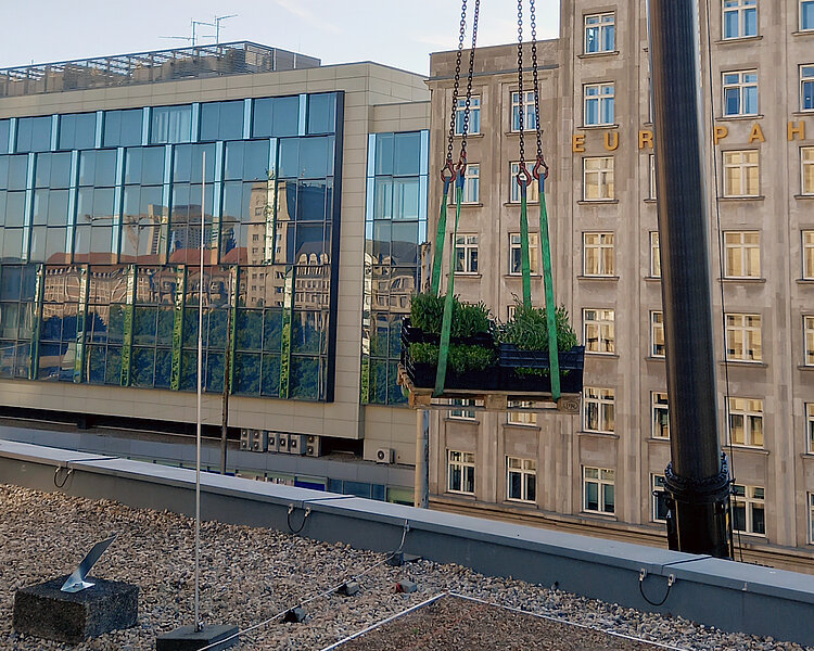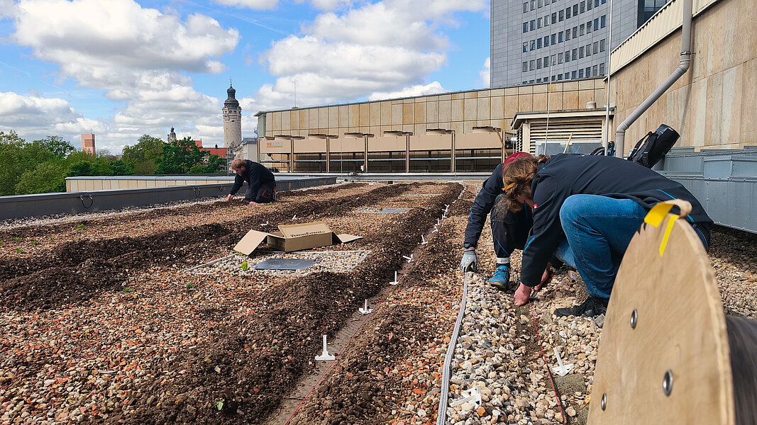 Das Gewandhaus zu Leipzig ersetzt die Kiesflächen auf seinem Flachdach teilweise durch Dachbegrünung, um einen Beitrag für eine klimaresilientere Stadt zu leisten. Damit die Pflanzen in einem guten Zustand bleiben, sind vielfältige Maßnahmen erforderlich. Um diese zu erproben und Erkenntnisse über das Management von Gründächern zu gewinnen, arbeitet das Gewandhaus eng mit Forschungseinrichtungen zusammen. Dazu gehören Forschende der HTWK Leipzig, des Forschungs- und Transferzentrums Leipzig (FTZ) und des Helmholtz-Zentrums für Umweltforschung (UFZ) in Leipzig.