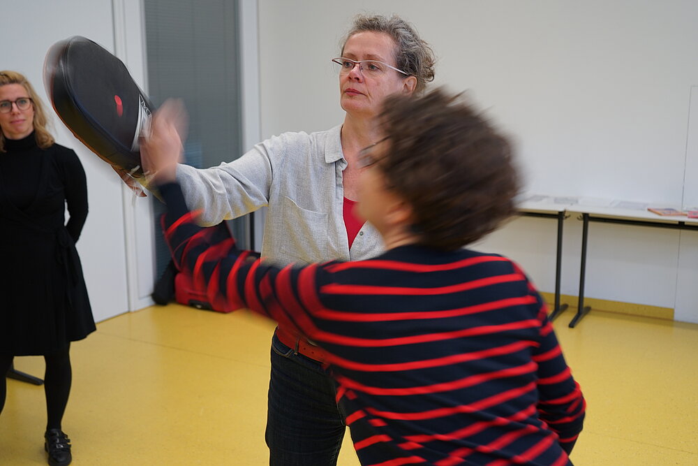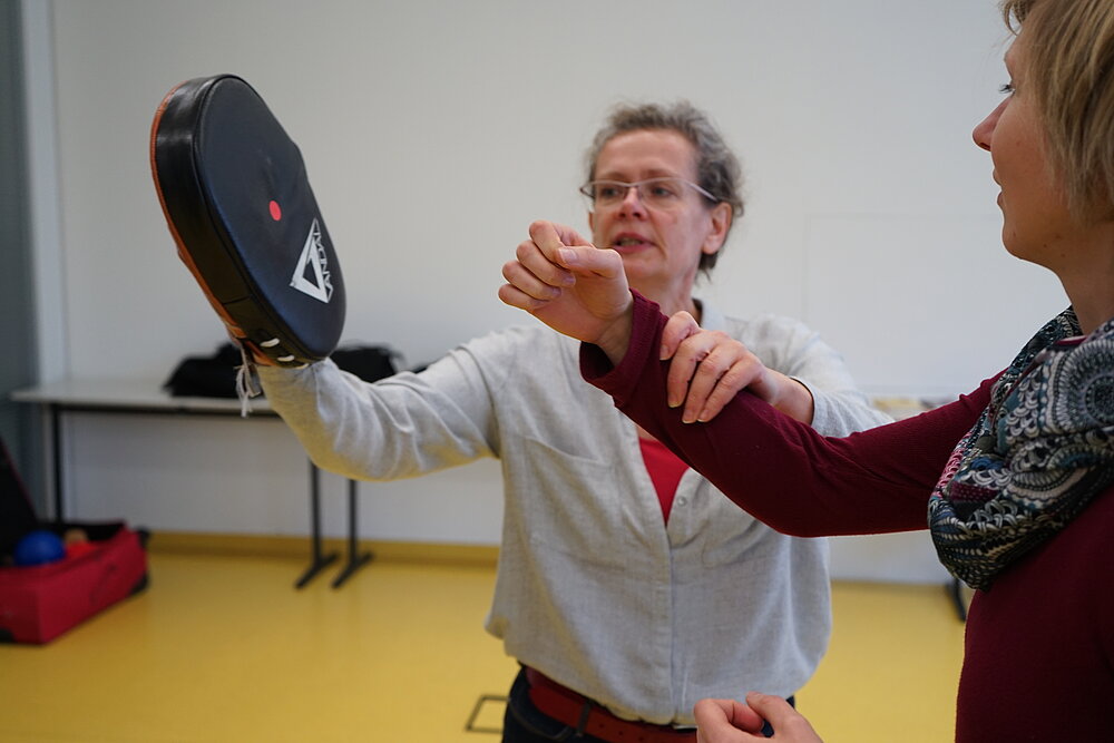 „Unsere Stimme, Fäuste und Körpersprache tragen wir immer bei uns – im Gegensatz zu einem Pfefferspray. All unsere Körperkräfte können wir gezielt einsetzen, um uns im Notfall zu wehren“, so die Trainerin. Wie insbesondere Frauen diese Mittel der Selbstverteidigung richtig einsetzen können, zeigte sie mit Hilfe praktischer Übungen: Die Teilnehmerinnen lernten selbstsichere Körperhaltung, unmissverständliches Nein-Sagen und das Verhalten in unangenehmen Situationen. Kernbotschaft: Sich es selbst erlauben, die eigenen – auch unangenehmen – Gefühle ernst zu nehmen. Sogar Zuschlagen war erlaubt: Am Ende des Workshops probierten alle Frauen kraftvolle, zielgerichtete Abwehrschläge aus – aufgefangen von einem Schlagpolster, einer sogenannten Pratze, die Lubetzki in der Hand hielt.