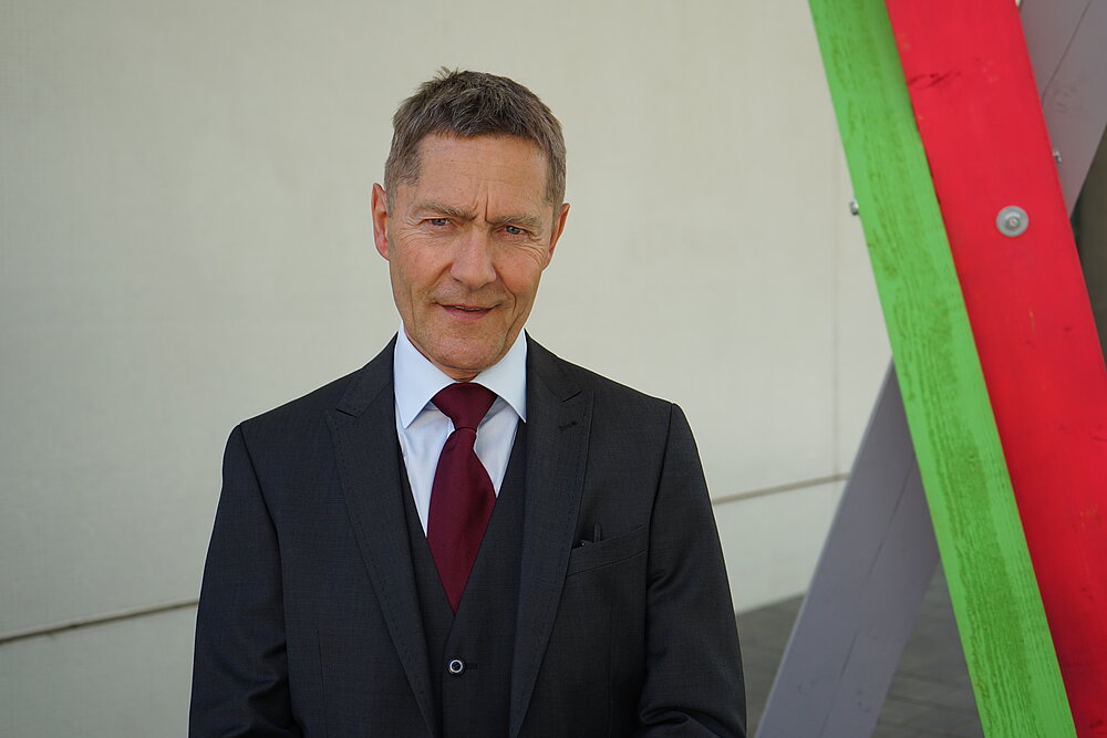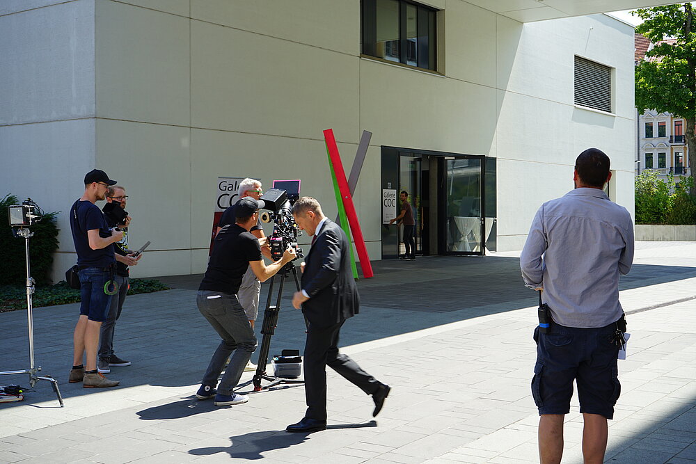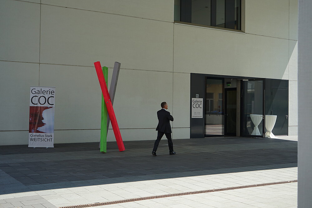 „Ist das Ihre?“ fragt Udo Schenk und zeigt auf die neonfarbene Holzskulptur vor dem Gebäude. Nein, ist sie nicht, obwohl so eine Galerie und ein Medienzentrum ja inhaltlich auch nicht sooo weit weg voneinander sind und man das durchaus denken könnte. Kunst am Bau - aber leider direkt wieder mitgenommen von den Filmausstattern.