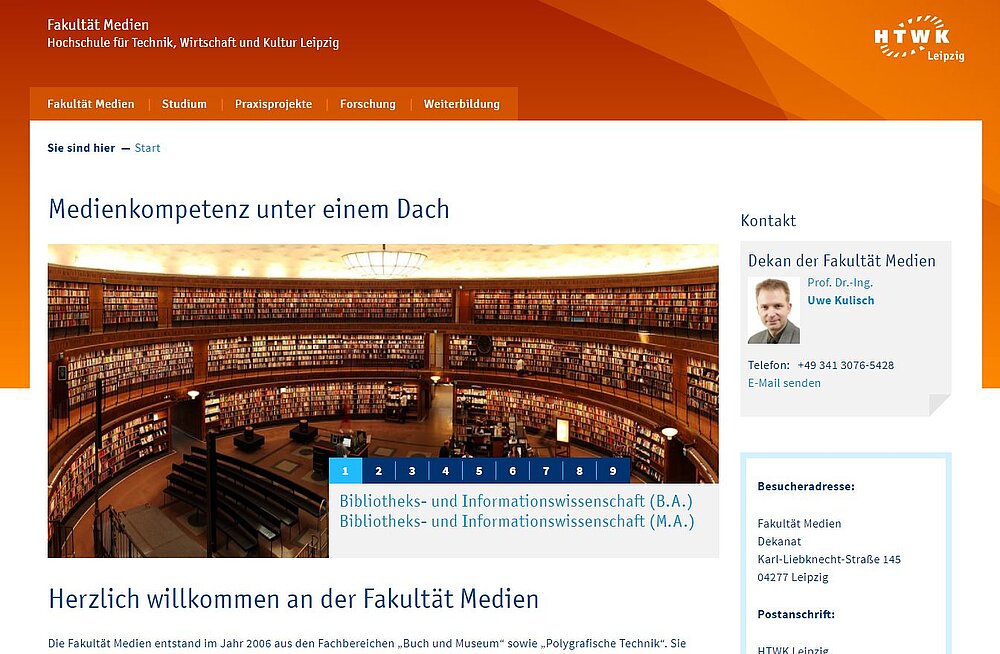 Unsere Fakultätsseiten funktionieren ähnlich, haben aber eigene Menüstrukturen und werden dezentral von eigenen Webmastern verantwortet. Zu unterscheiden sind sie vor allem durch den Einsatz der Fakultätsfarbe (die übrigens auch die Zugehörigkeit von Projektseiten sichtbar macht). Hier passt es zu erwähnen, dass der Relaunch auch dazu diente, das aktuelle Corporate Design erstmals auch für die Website umzusetzen.