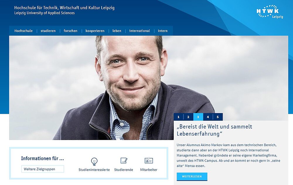 Das Hauptmenü ist weitgehend selbsterklärend: „kooperieren“ war vormals unter anderen Themen versteckt, für unser Dafürhalten griff das etwas zu kurz. Das ganz neue „leben“ löst studienbegleitende Themen etwas von den vollgepackten „studieren“-Kerninhalten, ohne richtig trennscharf zu sein. Apropos: Den für die Studierenden wichtigsten Reiter haben wir aufgeräumt – mit Vor, Im und Nach dem Studium folgten wir hier guten Ansätzen anderer Hochschulen.