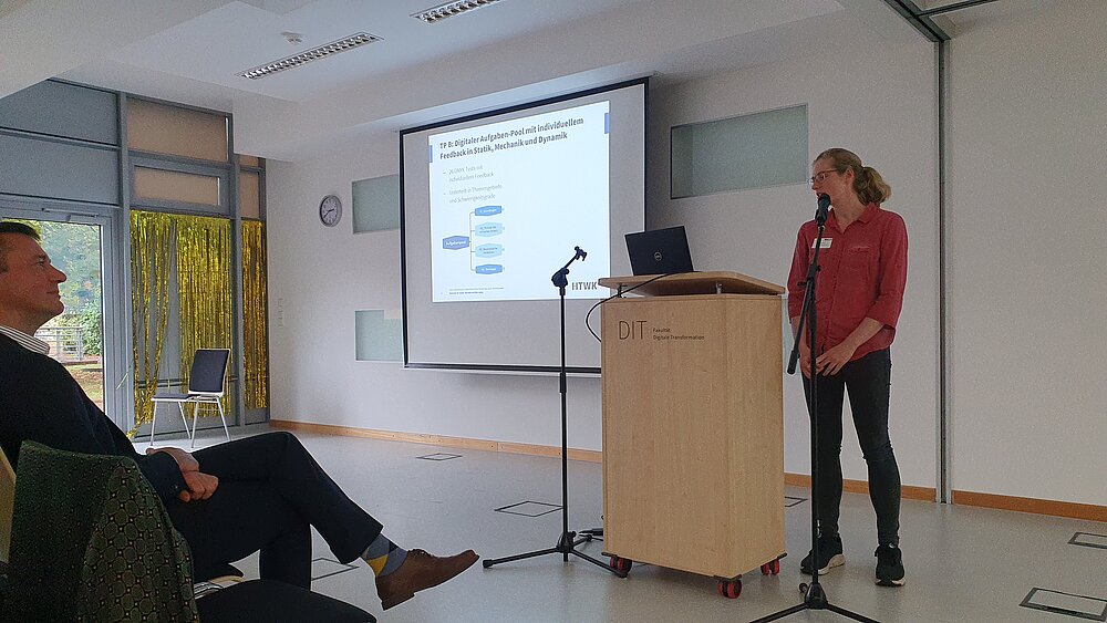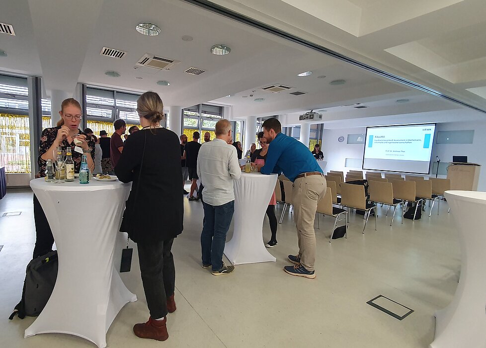 Das Abschluss-Event begann mit der Begrüßung durch den Prorektor für Bildung, Axel Klarmann. Die beiden Projektleiter Andreas Thor und Konrad Schöbel haben dann einen Blick zurückgeworfen auf die verschiedenen Facetten von vier Jahre Lehr-Lern-Projekt. Anschließend stellten sich die Teilprojekte in kurzen Pitches vor, bevor ausreichend Zeit an Ständen bestand, sich bei den Demopräsentationen selbst ein Bild zu den aktuellen Entwicklungen bei feedback-basierten E-Assessment in MINT-Fächern zu machen und das ein- oder andere Tool auch selbst auszuprobieren.