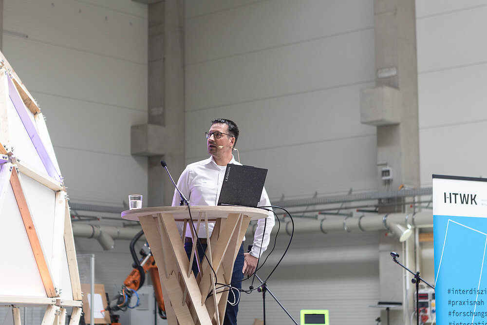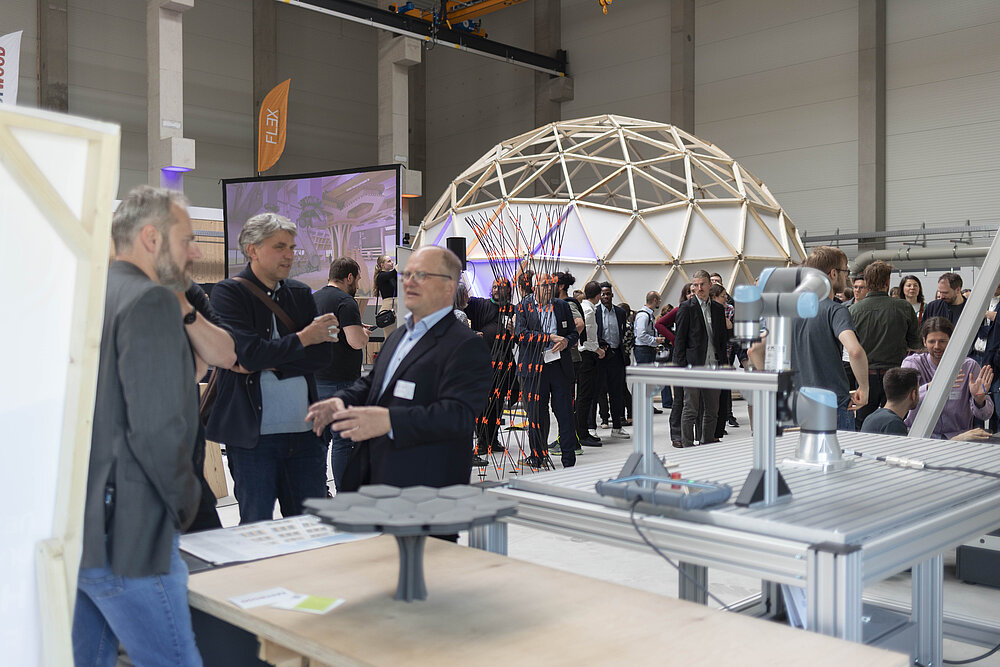 Die Forschungsgruppe FLEX verband mit der Veranstaltung zugleich ihr Jubiläumsfest zum 10-jährigen Bestehen, begleitet von einem Fachprogramm rund um digital basierte Konzepte für das ressourcensparende, kreislauffähige Bauen von morgen an der HTWK Leipzig. Zum Bauen mit Carbonbeton sprach Prof. Dr. Klaus Holschemacher vom Institut für Betonbau. Es folgten Vorträge von Tobias Rudloff vom Institut für Prozessautomation und Eingebettete Systeme über „Digitalbeton“ und von Prof. Dr. Ingo Reinhold vom iP³ Leipzig, dem Institute for Printing, Processing and Packaging Leipzig, über Additive Fertigung. Danach gaben Mitarbeitende der Forschungsgruppe FLEX in weiteren Vorträgen Einblicke zur Robotik im Holzbau, zur Nutzung von Künstlicher Intelligenz sowie zu den Potenzialen durchgängig digitaler Wertschöpfungsketten.