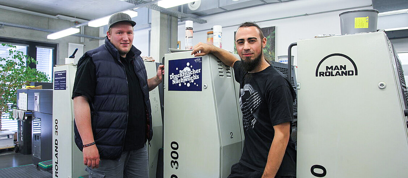 Kilian ist gelernter Mediengestalter und arbeitet nebenher als selbständiger Webentwickler und Fotograf. Marco ist ebenfalls gelernter Mediengestalter, fasziniert von Technik. Ein Grund, warum er sich für die Drucktechnik entschieden hat.